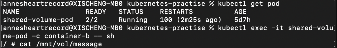 首先创建一个有共享卷的pod,然后我们进入到b容器的内部,能看到:b容器中的文件能感知到a容器对其的修改,证明a、b容器共享卷中的文件。