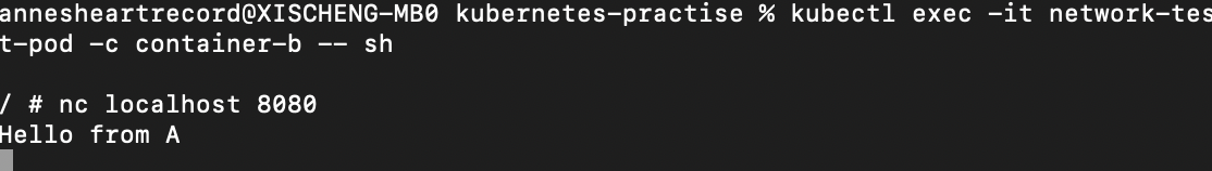 kubectl exec -it network-test-pod -c container-b -- sh这个命令的含义如下