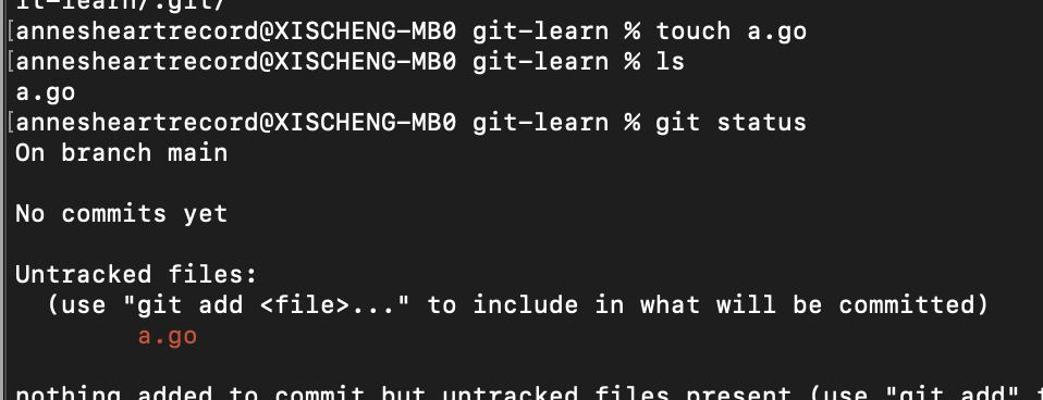 创建一个新文件,能看出来默认是Git不会追踪这个新文件的,文件出现在对应的untracked files中。