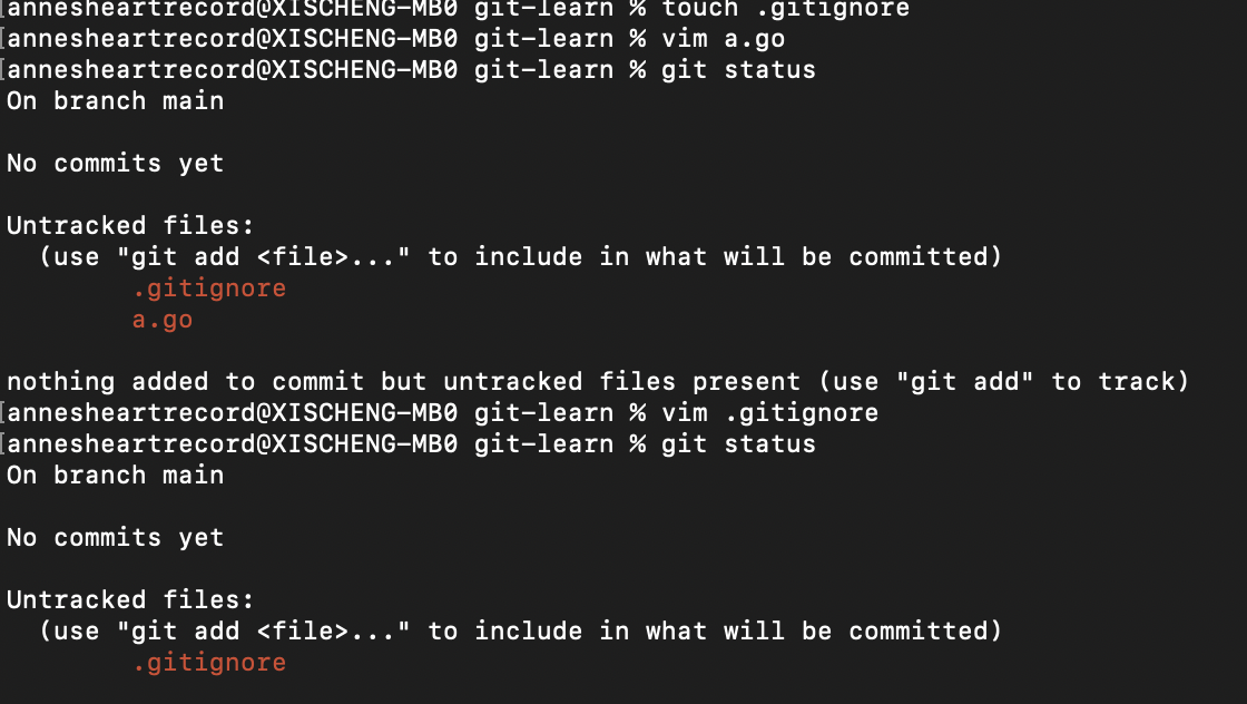 这里会默认从.gitignore的当前目录进行查找,忽略当前目录下a.go文件的改动。