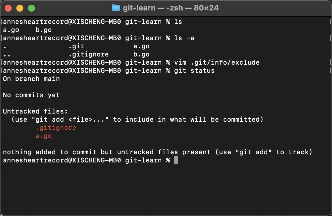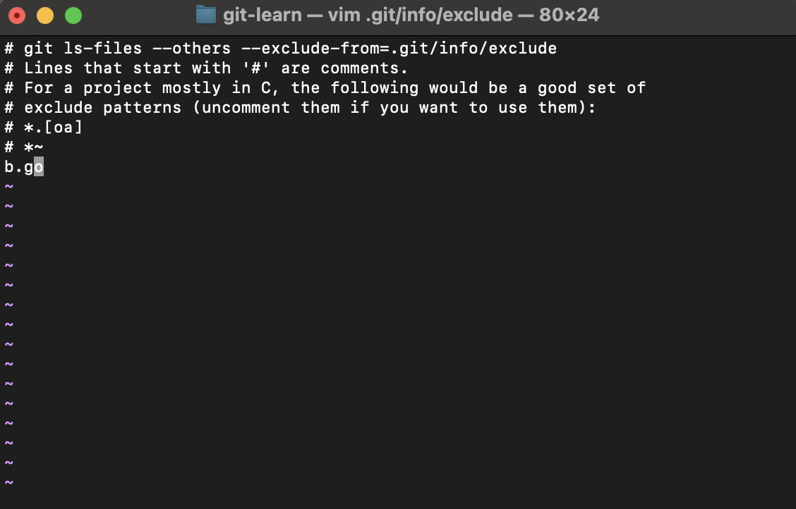 我们先创建一个b.go文件,然后在git/info/exclude中添加对应文件的追踪。